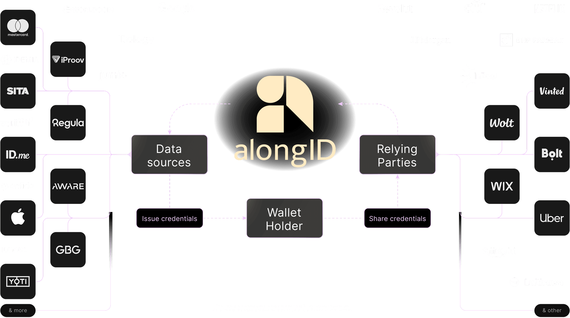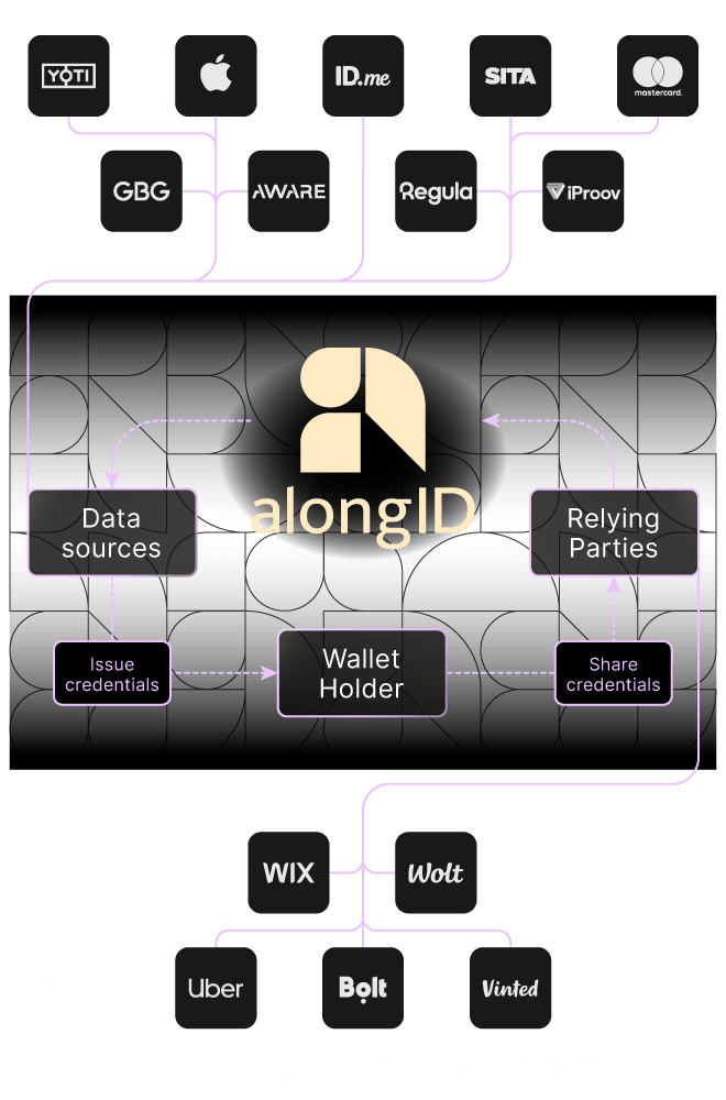 The alongID orchestration engine is the central hub connecting Data Sources and Verifiers. Businesses set up onboarding and verification flows with a drag-and-drop workflow builder, while users store and share verified credentials securely on their alongID wallet, eliminating repetitive checks. By collaborating with banks, FinTechs, marketplaces, and diverse data sources, we decentralize access to verified data and unlock its global potential. Plug-and-play access to a global network makes the alongID ecosystem collaborative, interoperable, and ready for action—far more than just another infrastructure or the wallet.
